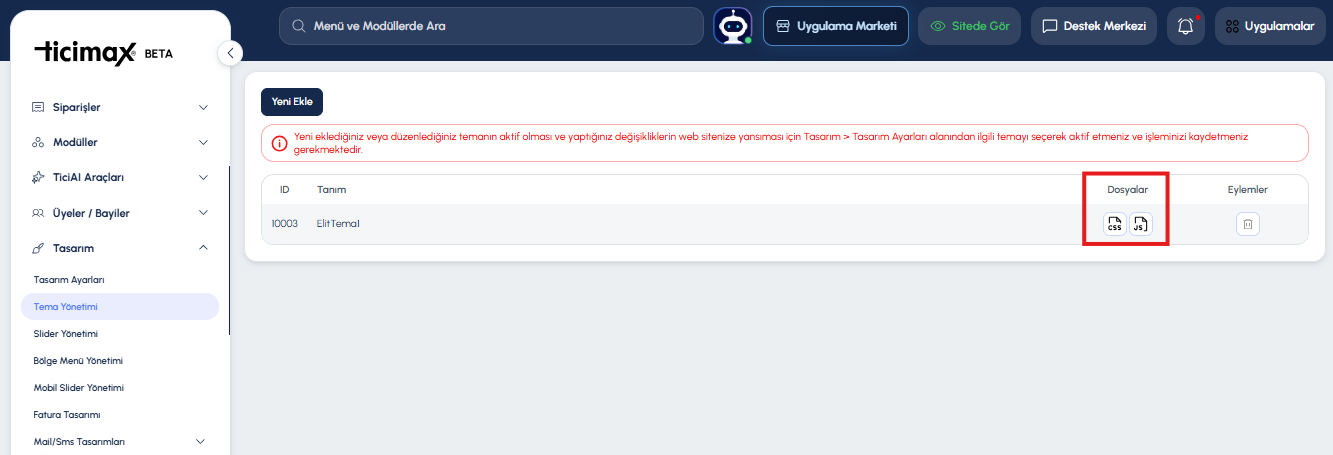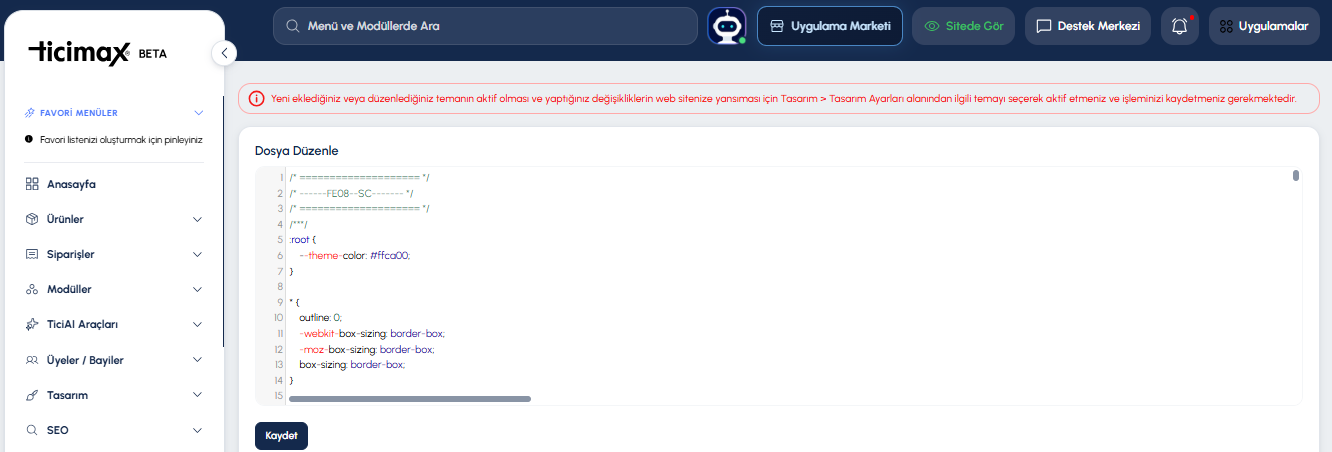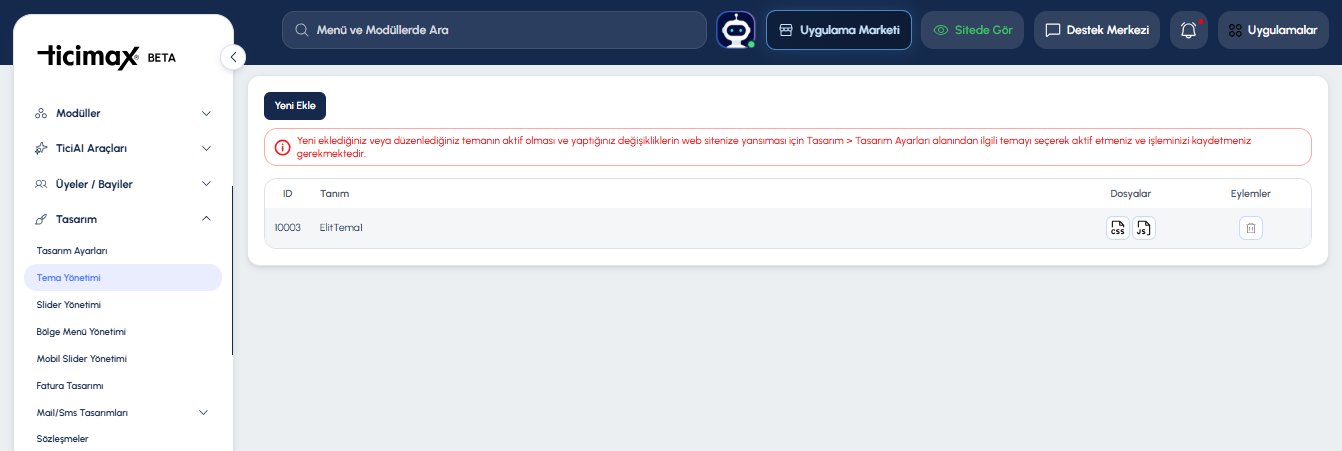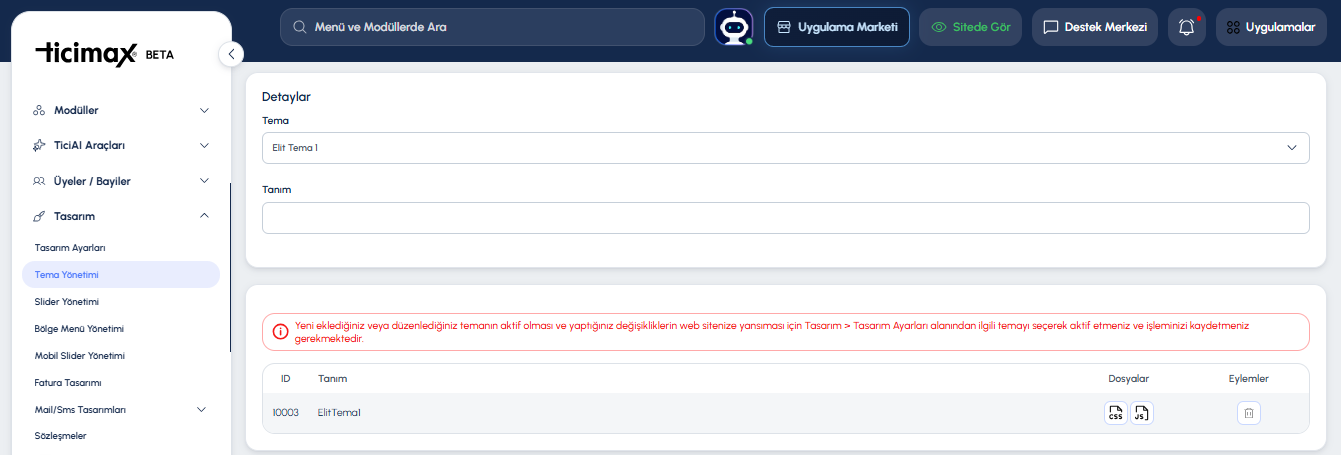 NOT: Yeni eklediğiniz veya düzenlediğiniz temanın aktif olması ve yaptığınız değişikliklerin web sitenize yansıması için Tasarım > Tasarım Ayarları alanından ilgili temayı seçerek aktif etmeniz ve işleminizi kaydetmeniz gerekmektedir.