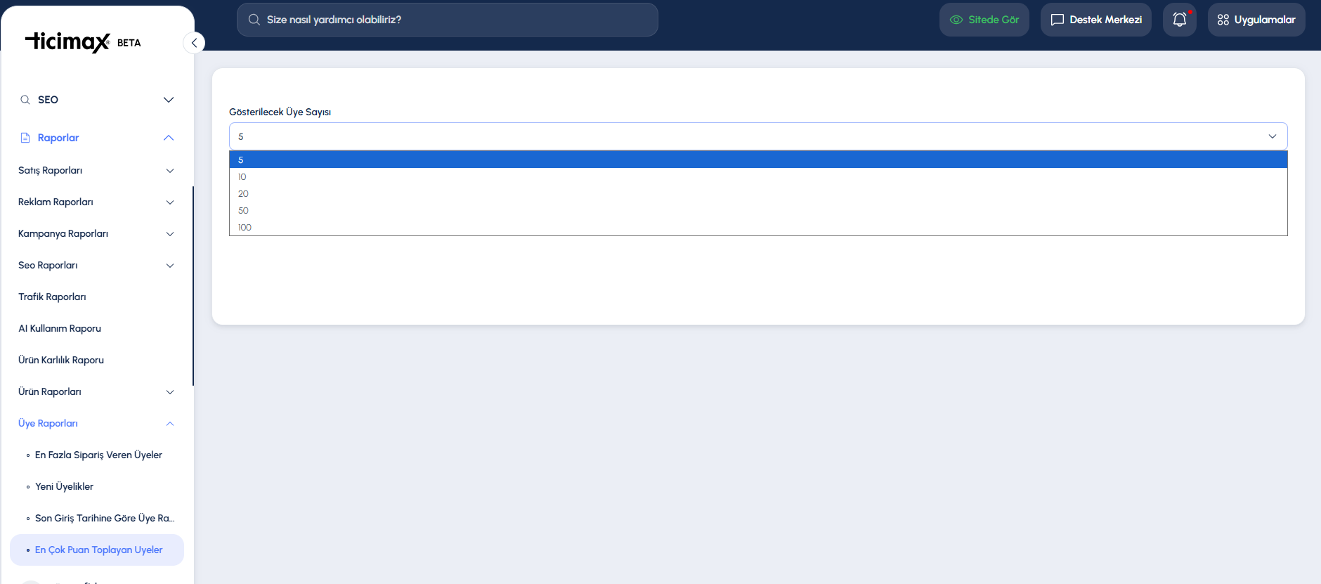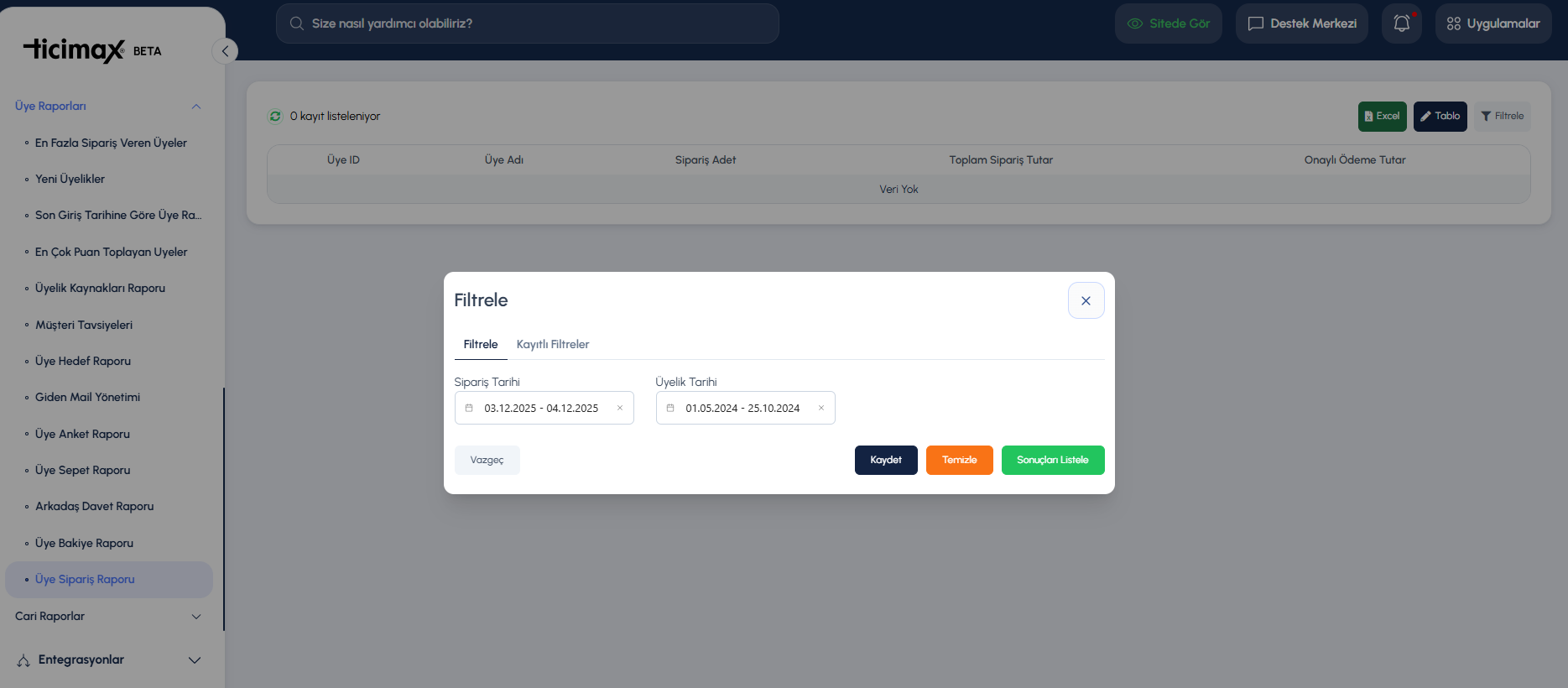 Bu rapor ile belirli bir tarih arasında en çok sipariş veren üyelerinizi aşağıdaki örnek ekran görüntüsünde olduğu gibi filtreleyerek raporlayabilirsiniz.