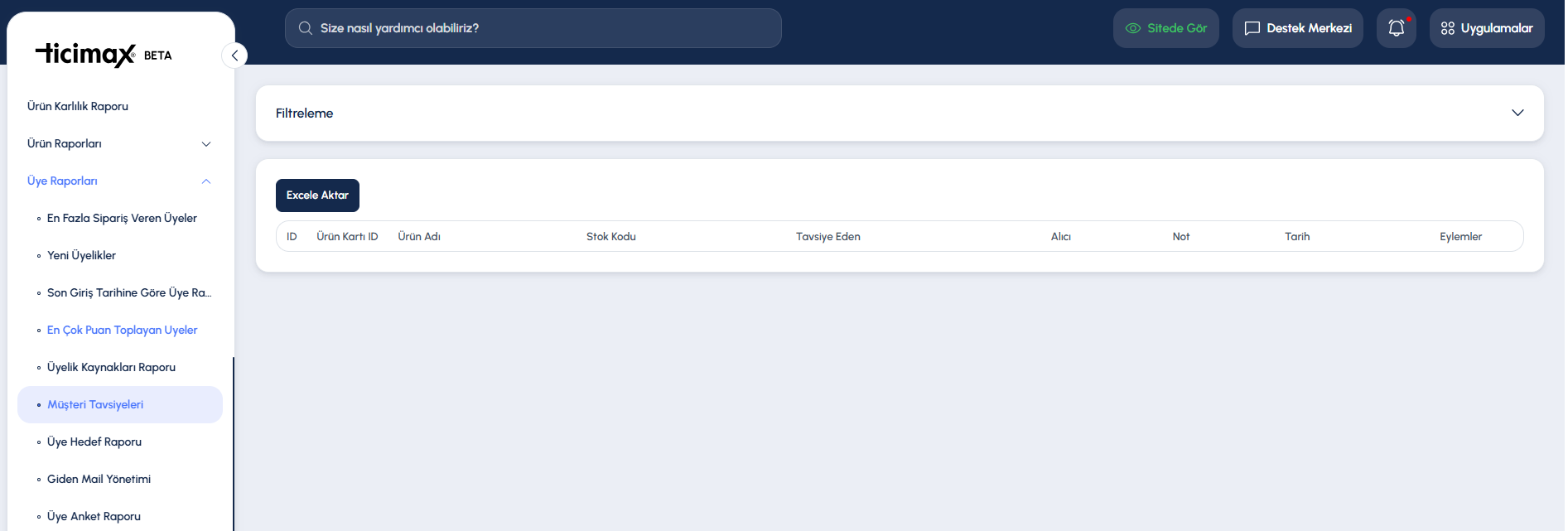 Müşterilerinizden gelen tavsiyeleri bu rapor altında görüntüleyebilirsiniz.
