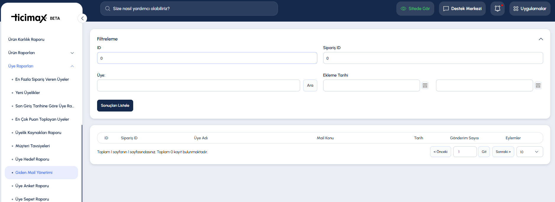 id, ekleme tarihi, sipariş ya da üyeye göre filtre yaparak giden mailleri listeleyebilir, sipariş detayına, üye detayına ve mail detayına ulaşabilir.