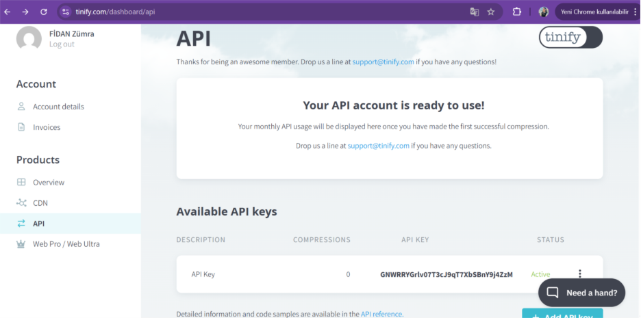 Burada sizin için otomatik oluşturulmuş API Key gözükecek.