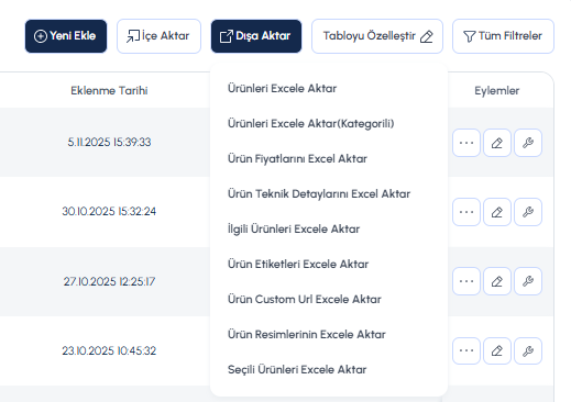Ne işe yarar: Sistemde bulunan tüm ürünlerin (veya aktif filtrelere uyan ürünlerin) temel verilerini tek Excel dosyasına aktarır.